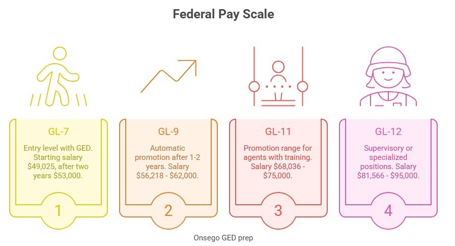 Your GED diploma opens doors to every state and federal agency, and your earnings and job security will be fine. The U.S. government uses a federal pay scale for law enforcement positions that functions as follows (GL Levels):