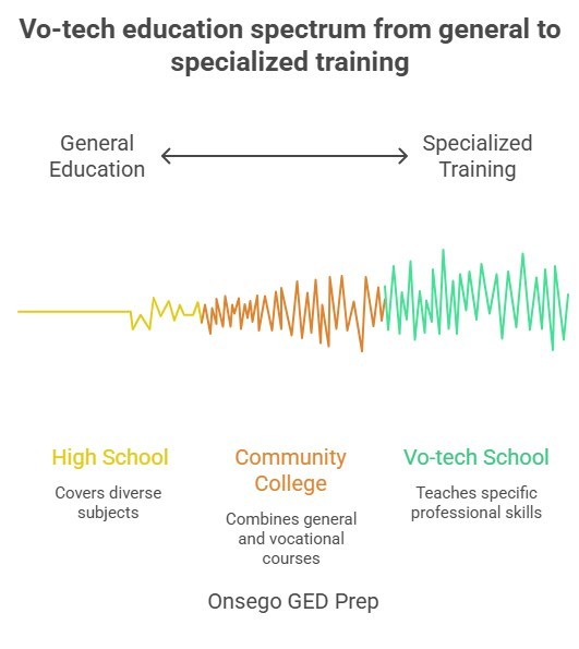 Vo-tech schools teach specific professional skills. You don’t take general education classes like English or history. You learn one trade from start to finish.